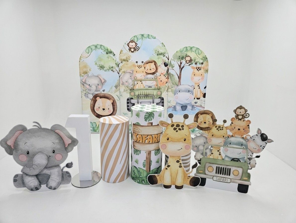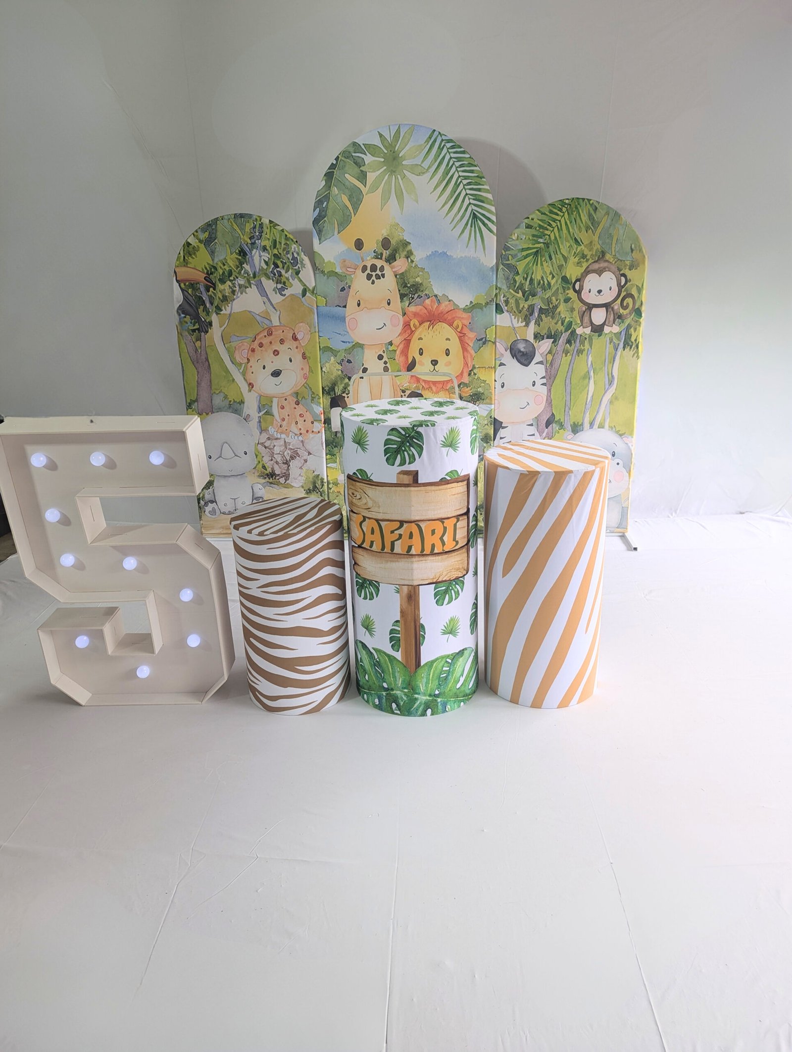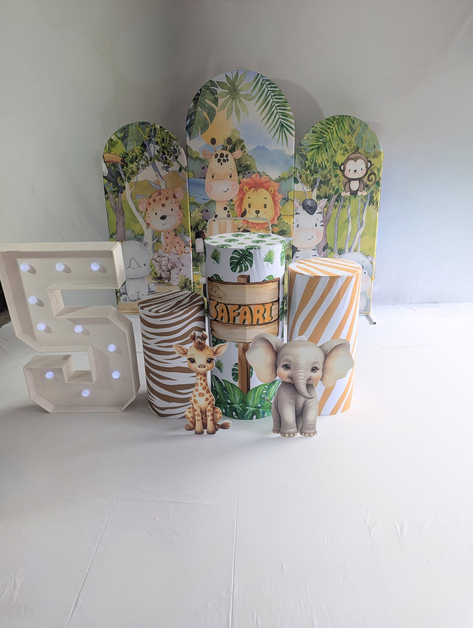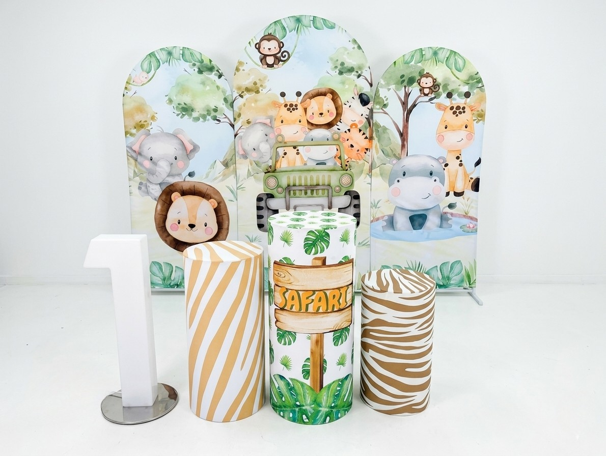 A mix of greenery, safari props, and bold colours creates an exciting atmosphere.